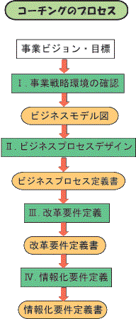 ■要所要所での気付き情報を提供 ■広く実証された方法論で、関係者間の合意形成をえな がら進める ■常にコーチャーの豊富な経験則でアドバイス |